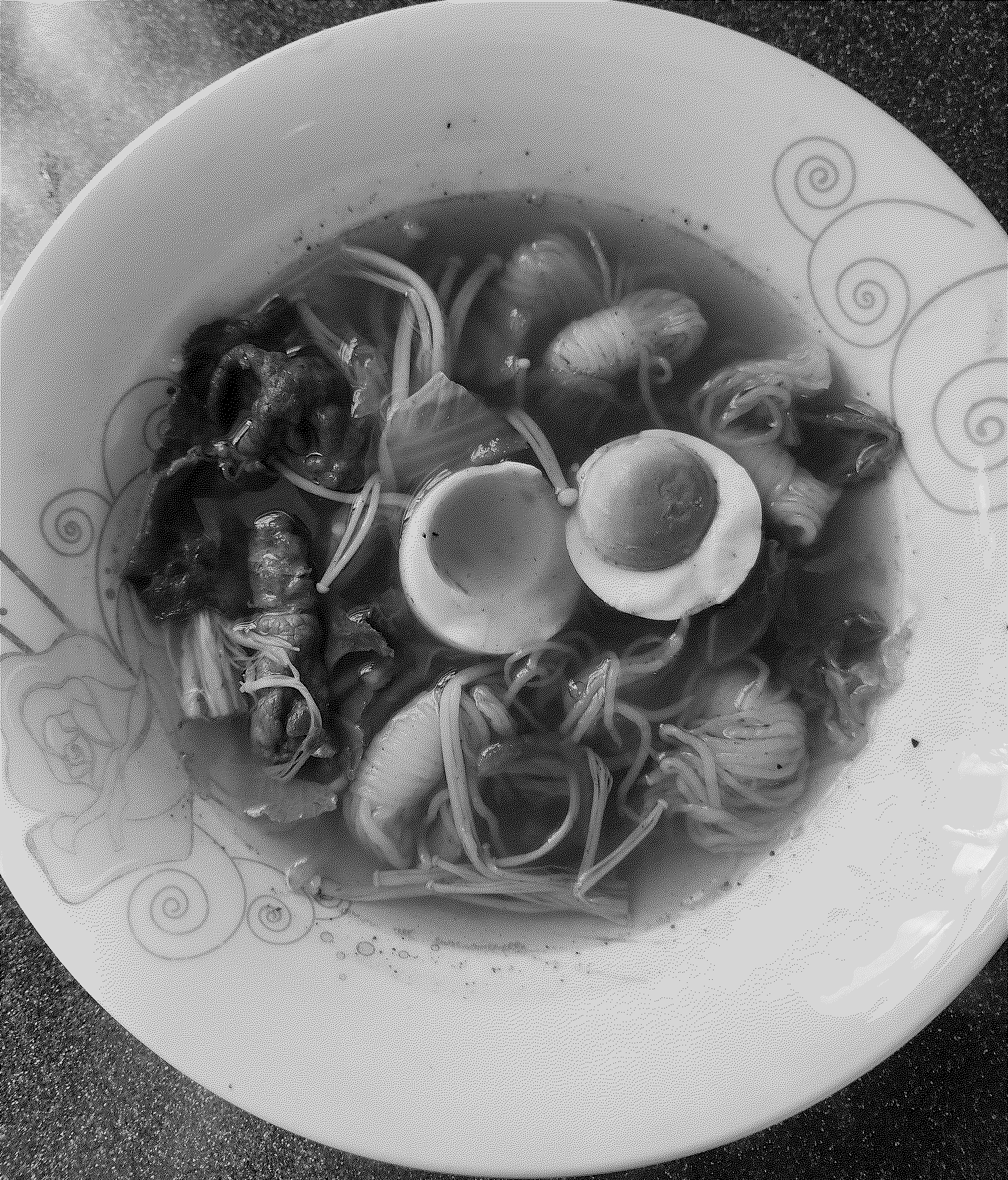 1. start boiling desired amount of water, when it begins to heat up add in soy sauce, chicken powder
